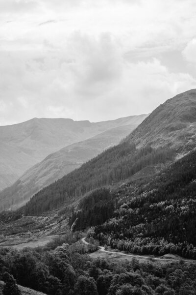 Deze rustige print vangt de uitgestrektheid van het Schotse landschap, met een eenzame weg die uitnodigt tot ontdekken en reizen