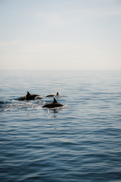 Drie dolfijnen zwemmen speels door het heldere oceaanwater, een moment vol vrijheid en harmonie. Deze frisse en levendige print brengt beweging en rust in je interieur.