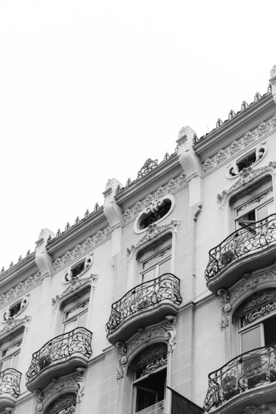 Deze stijlvolle zwart-wit print laat de sierlijke gevel van een historisch pand tot leven komen. De elegante balkonnetjes en verfijnde details brengen een vleugje romantiek en karakter in beeld. Een stille ode aan architectuur met een ziel.