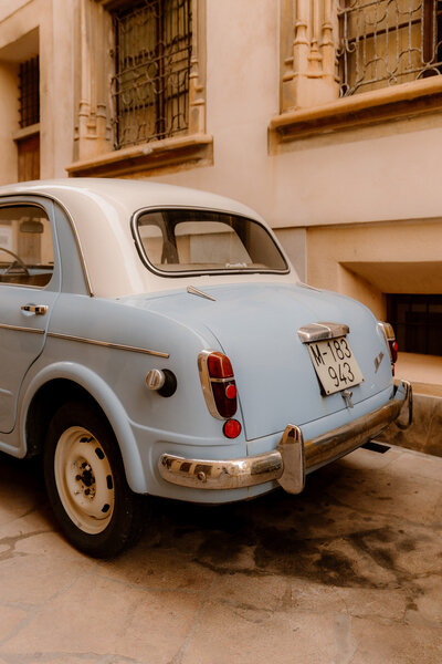 Deze charmante retro oldtimer staat te pronken in een zonnig Spaans straatje. Een tijdloze knipoog naar vintage, charme en mediterrane flair.